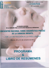 Encuentro Nacional sobre Diagnóstico Precoz de la Sordera Infantil [Texto impreso] : de la detección a la inclusión : programa y libro de resúmenes : Madrid, 20 y 21 de octubre de 2011 / organizado por la Comisión para la Detección Precoz de la Hipoacusia (CODEPEH) y la Confederaión Española de Familias de Persnas Sordas (FIAPAS)